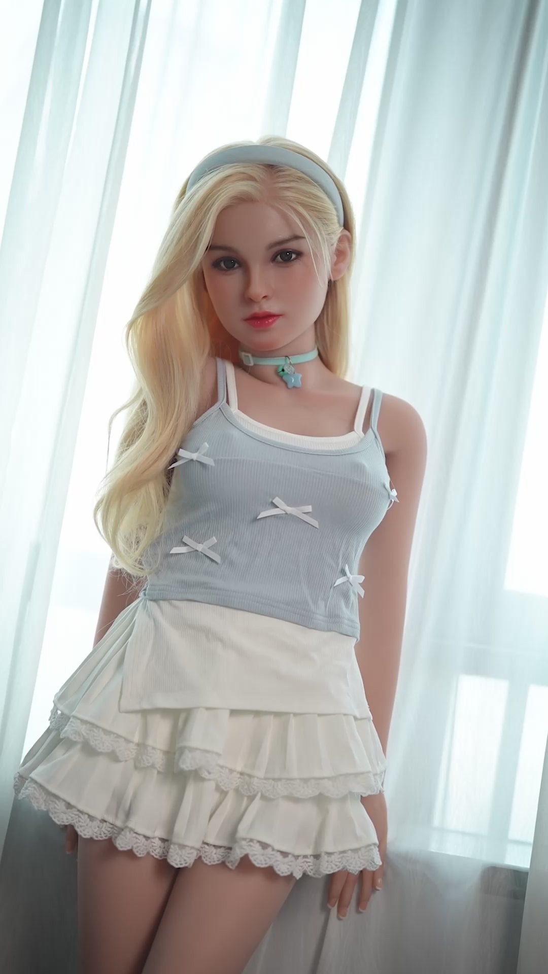 Isla, a doll with long, flowing blonde hair, held a bouquet of delicate blue flowers, her eyes reflecting a serene beauty. Her fair skin and striking features were accentuated by the soft, natural lighting. She wore a light blue top with thin straps that highlighted her slender shoulders and a white, ruffled skirt that added a touch of innocence to her appearance. Her lips, painted a soft pink, curved into a gentle smile, inviting you into her enchanting world. The delicate blue headband that matched her top added a playful yet elegant touch to her overall look. She stood with grace, her posture exuding a sense of tranquility and allure.